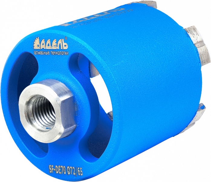 Алмазная коронка с пылеудалением для подрозетников по железобетону Адель Super Fast SF DE-D70 Пылеуловитель 72/65 мм (Adel Супер Фаст СФ ДЕ-Д70 Пылеуловитель 72/65 мм) с пылеуловителем М18 – М16 и центрирующим стержнем предназначена для скоростного сверления железобетона (армированного бетона), бетонных блоков, газобетона, кирпича и других строительных материалов с использованием ручного электроинструмента без охлаждения водой.